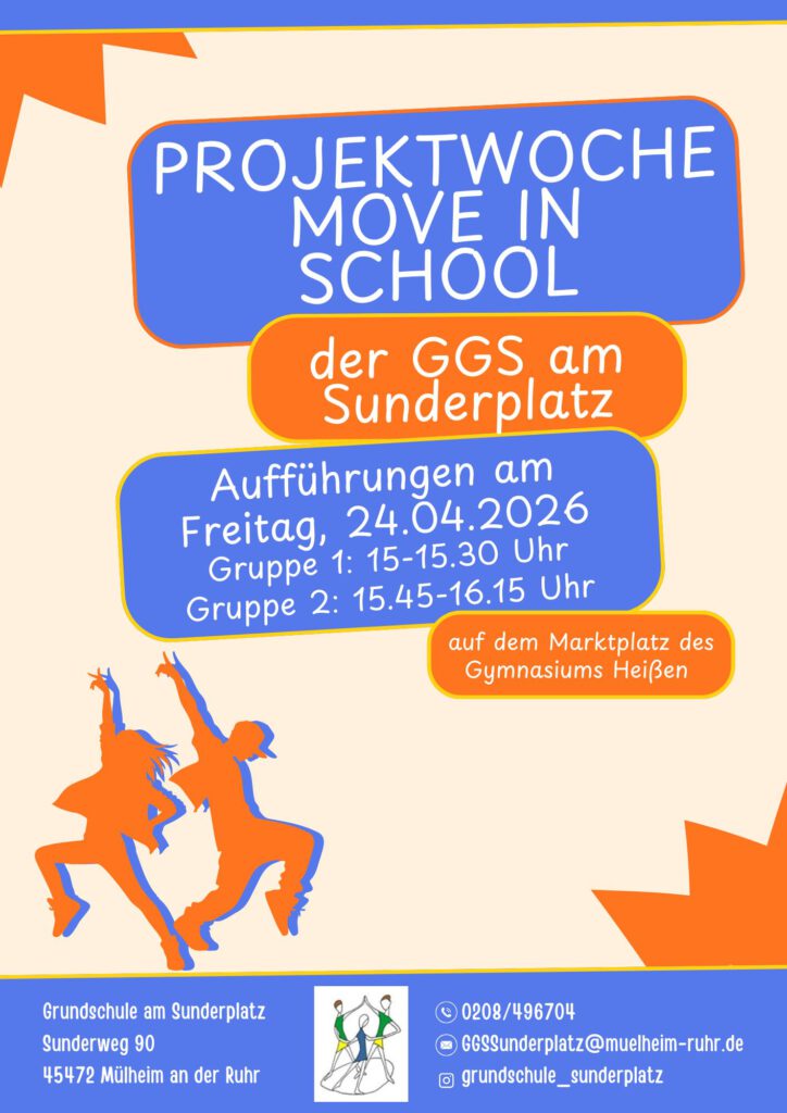 Wir freuen uns auf unsere Projektwoche „Move in school“ vom 20.4. – 24.4.2026. Projektzeit ist Montag – Donnerstag von 8.00 – 13.00 Uhr. Freitag ist der Ablauf zeitlich etwas anders: um 9.50 Uhr starten wir. 🙂